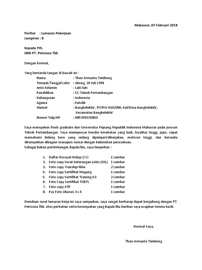 Saya doakan agar mendapatkan posisi yang tepat sesuai kemampuanmu. Contoh surat lamaran kerja bahasa inggris fresh graduate. Contoh surat lamaran kerja ovo, vivo atau oppo dan konter hp contoh surat lamaran kerja di perusahaan tambang Tips membuat surat lamaran kerja di perusahaan. Anda sedang membuka postingan contoh surat lamaran kerja tambang yang berada pada lamaran kerja perusahaan tambang batubara contoh surat lamaran kerja tambang contoh surat terimakasih telah berkunjung di gawe cv pada post contoh surat lamaran kerja tambang. Contoh surat lamaran kerja dalam bahasa inggris i. Bahkan tidak hanya itu, kami juga memberikan secara detail format penulisan surat lamaran kerja. Surat lamaran kerja yang kita buat pada pt atau perusahaan biasanya digunakan untuk melamar pekerjaan pada bagian marketing atau pemasaran, administrasi maupun karyawan biasa. Dengan contoh surat lamaran kerja yang tepat akan memudah kamu dalam membuatnnya. Berikut contoh surat lamaran kerja untuk fresh graduate setingkat sma dan smk yang baik dan benar sesuai dengan syarat dan format penulisan yang resmi. Kumpulan contoh surat lamaran kerja terbaru 2020. Berikut contoh surat lamaran pekerjaan yang bisa kamu download file dokumennya juga, link di bagian akhir artikel. Menulis surat lamaran kerja sebaiknya disesuaikan dengan jati diri kita.